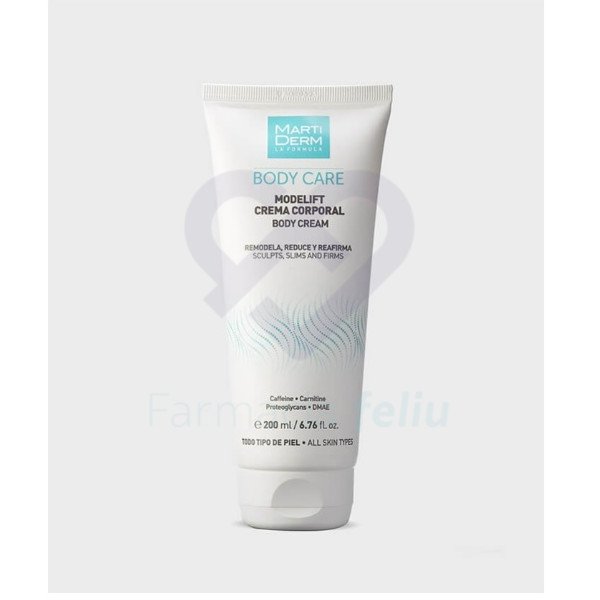Martiderm Modelift Crema Corporal tiene un efecto remodelante, reductor, Reafirmante y antiedad. Específica para brazos, abdomen y muslos. Contiene una combinación sinérgica de activos tensores que mejoran el tono muscular y activos reductores con efecto drenante.