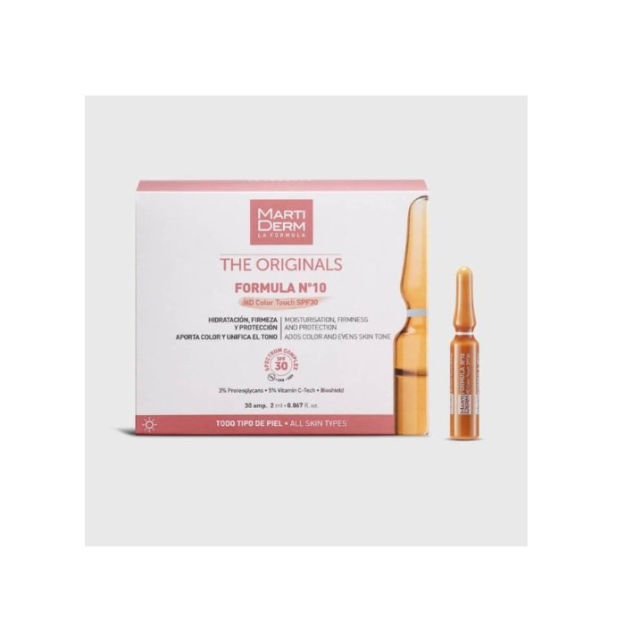 Las ampollas Martiderm Formula 10 Colour Touch aportan hidratación, estructura y firmeza, además de acelerar la regeneración de la piel desde las capas más profundas. Protegen, reparan e iluminan la piel con un rápido efecto.
