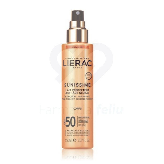 Leche Solar Lierac SPF50+ corporal y facial 150ml. Protección muy alta invisible, resistente al agua y con activos antiedad. Textura ultraligera.