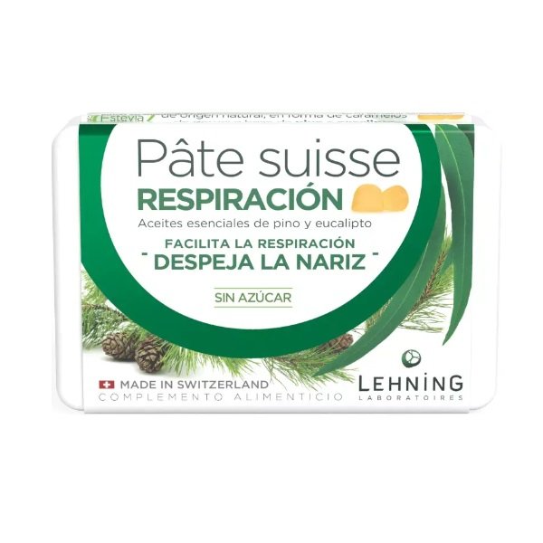 Lehning Pâte Suisse Respiración son unas gominolas formuladas con aceites esenciales de pino y eucalipto, conocidos por sus altos beneficios sobre las vías respiratorias. Facilita la respiración  y despeja la nariz en personas con resfriado, congestión y secreción nasal.