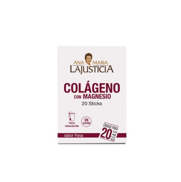 Ana Mº Lajusticia Colágeno con Magnesio Sabor Fresa El colágeno es la proteína más abundante en el cuerpo humano, siendo el constituyente esencial de los cartílagos, tendones. Todo el tejido conectivo de nuestro cuerpo y articulaciones está formado por colágeno. Las proteínas contribuyen a conservar y aumentar la masa muscular, así como al mantenimiento de los huesos en condiciones normales. A este compuesto le hemos añadido Magnesio, que es un mineral que desempeña un papel en la síntesis proteica normal. Asimismo, el magnesio contribuye al funcionamiento normal de los músculos.