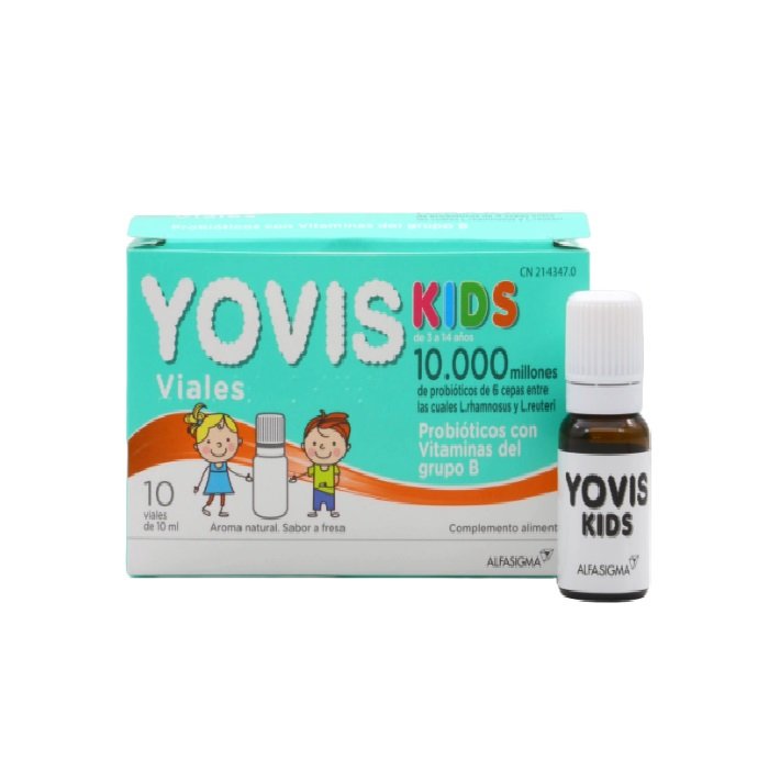 Yovis Kids 10 Viales Bebibles es un complemento alimenticio a base de probióticos, vitaminas del grupo B e hinojo, indicado entre las edades de 3 y 14 años. Contiene 10.000 millones de probióticos de 6 cepas diferentes entre las cuales se encuentran: