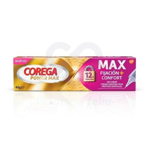 Corega Power Max Fijación + Confort es una crema fijadora para prótesis dentales, sin sabor. Esta nueva pasta fijadora de Corega ofrece 12 horas de fijación y confort de la prótesis superior, la prótesis inferior y también las prótesis parciales.